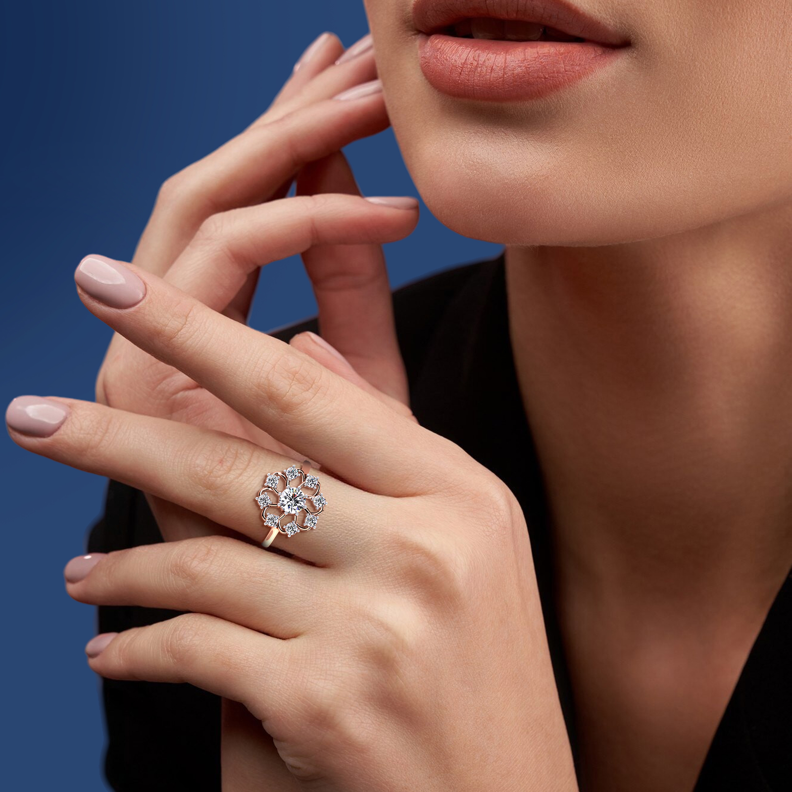 An exquisite diamond ring featuring a stunning central round brilliant diamond encircled by a delicate petal-like arrangement of accent diamonds. This captivating cluster design offers exceptional sparkle and brilliance, perfect for any special occasion.