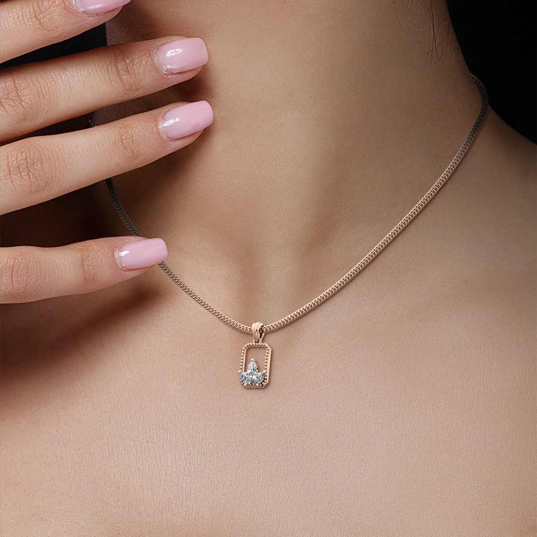 The Petal Frame Diamond Pendant blends classic beauty with a modern touch. At the center, three pear-cut diamonds form a pretty petal-like shape, giving it a soft, floral look. The diamonds sit inside a unique rectangular frame with beaded detailing, making the pendant stand out with style. Simple, delicate, and full of charm, this pendant is a lovely addition to your jewelry collection.