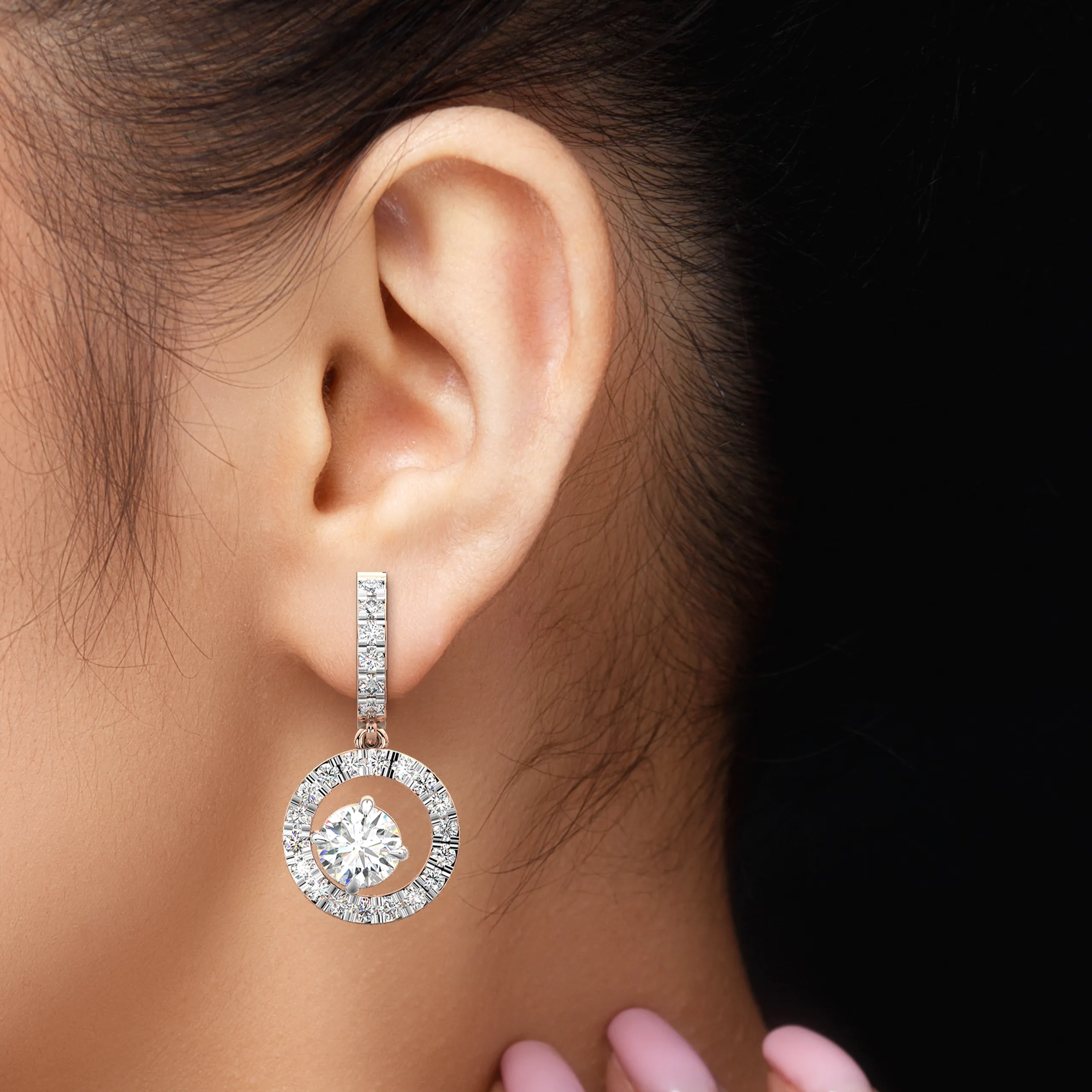 Radiant Orbit Diamond Earrings feature a shimmering circle of diamonds anchored by a central solitaire, designed to elevate every look with unmatched brilliance.