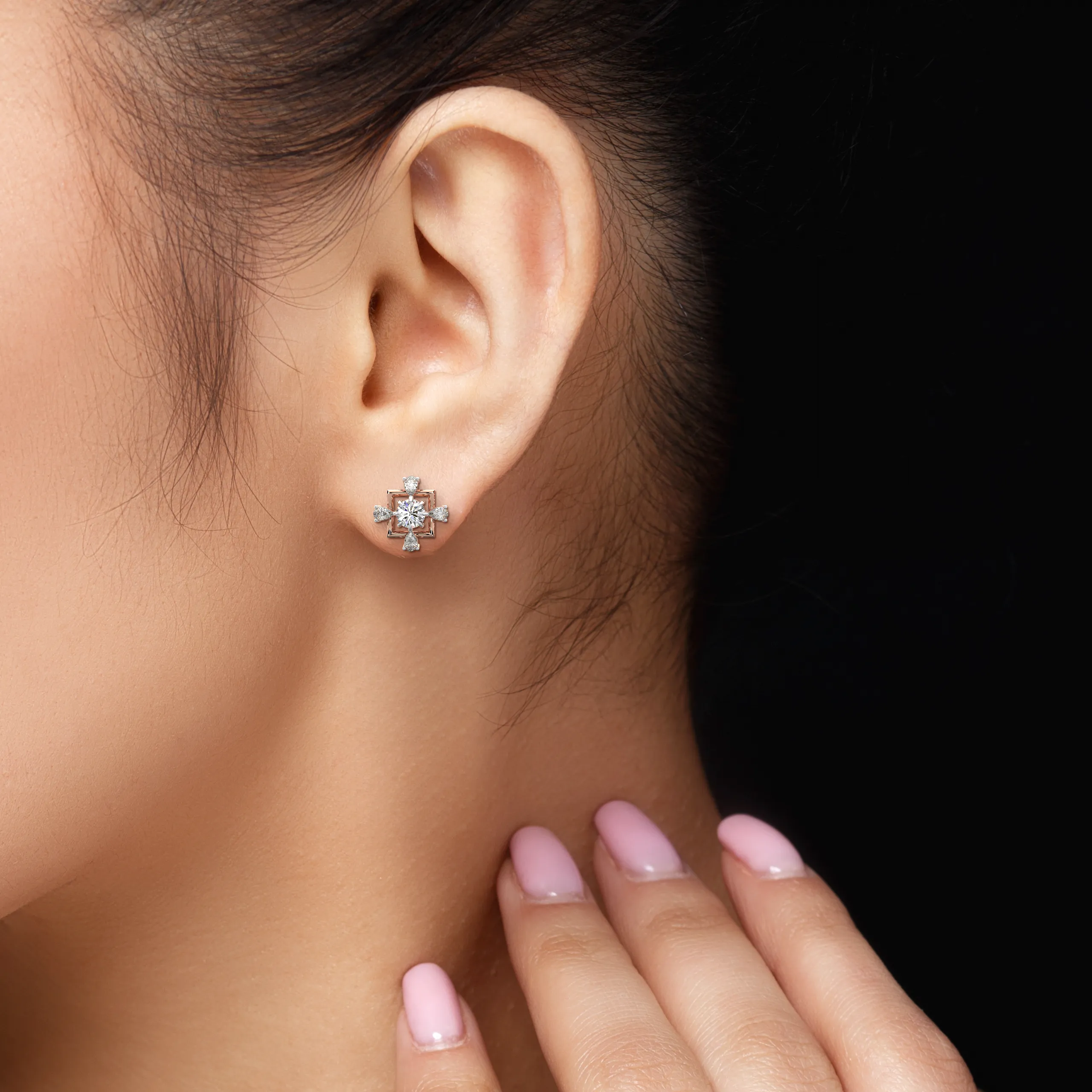 The Regalia Crossfire Earrings celebrate balance and brilliance with a bold square frame surrounding a radiant cross-shaped cluster of diamonds. Each earring showcases a luminous central diamond, gracefully complemented by four pear-cut diamonds that radiate outward in perfect harmony. The geometric contrast of the outer frame adds a structured touch to the soft sparkle of the diamonds, creating a look that is both powerful and refined. Designed for those who appreciate unique elegance, these earrings make a strong yet graceful statement at every occasion.