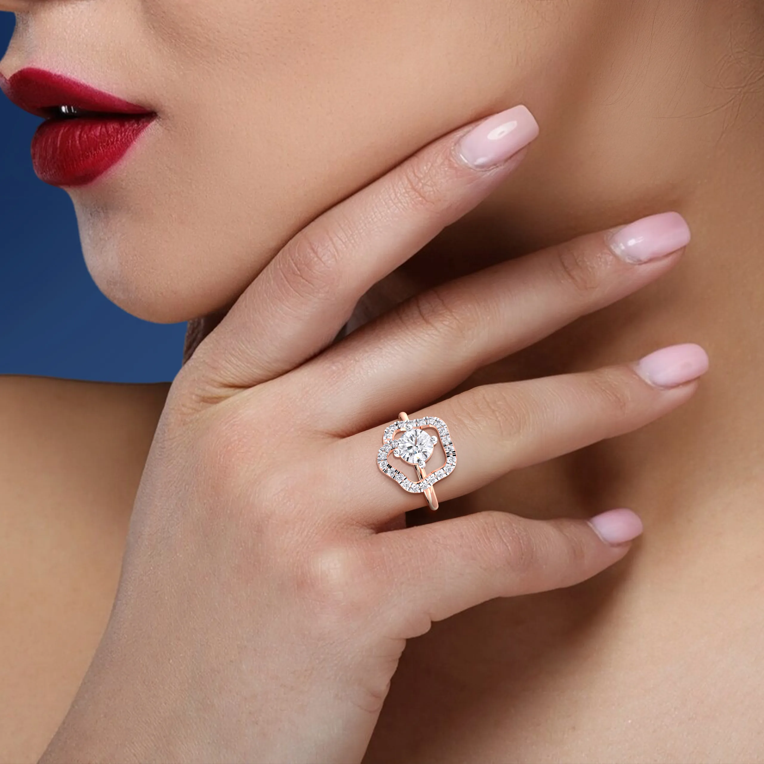 The Aurora Twist Diamond Ring captures a dynamic blend of elegance and artistic design. At its heart lies a luminous round diamond, framed by a fluid, twisting halo that is encrusted with meticulously set brilliant diamonds. Designed for those who appreciate statement-making craftsmanship, this ring radiates brilliance and refined charm from every angle.