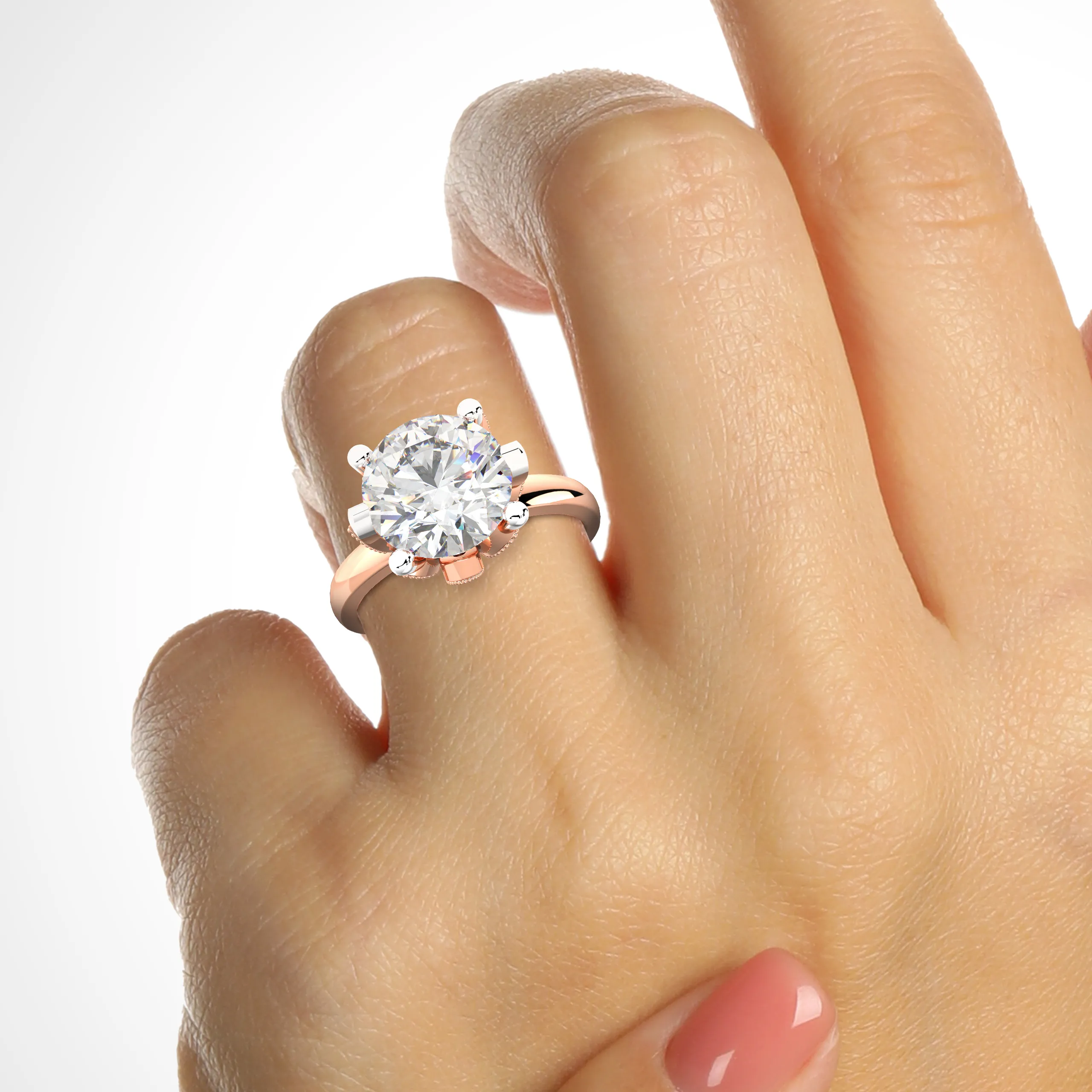 An ethereal diamond ring featuring a round brilliant center set in pavé-studded petal prongs — a modern tribute to blossoming elegance.
