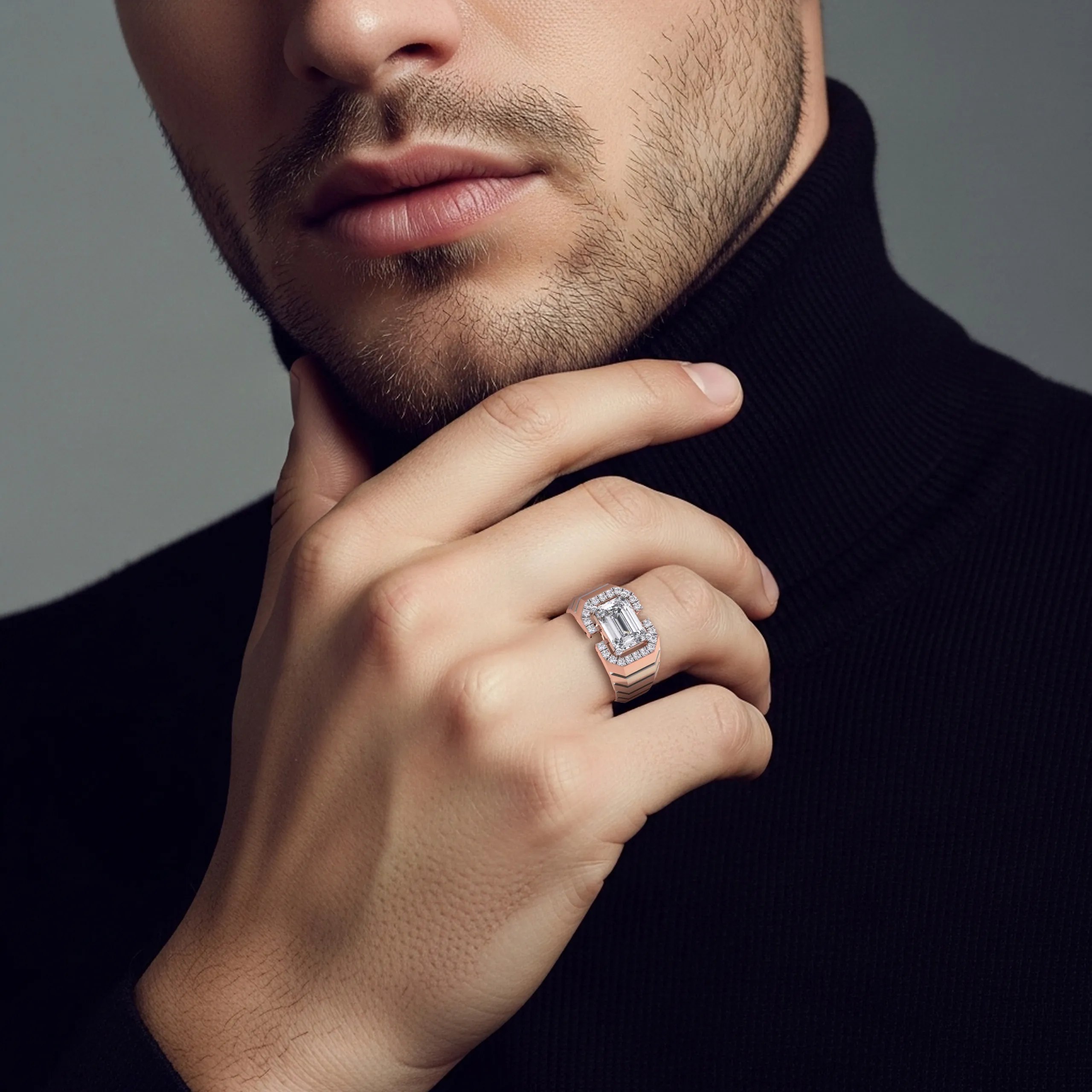 A striking men’s ring featuring a large emerald cut diamond, framed with sparkling round diamonds and bold layered detailing.