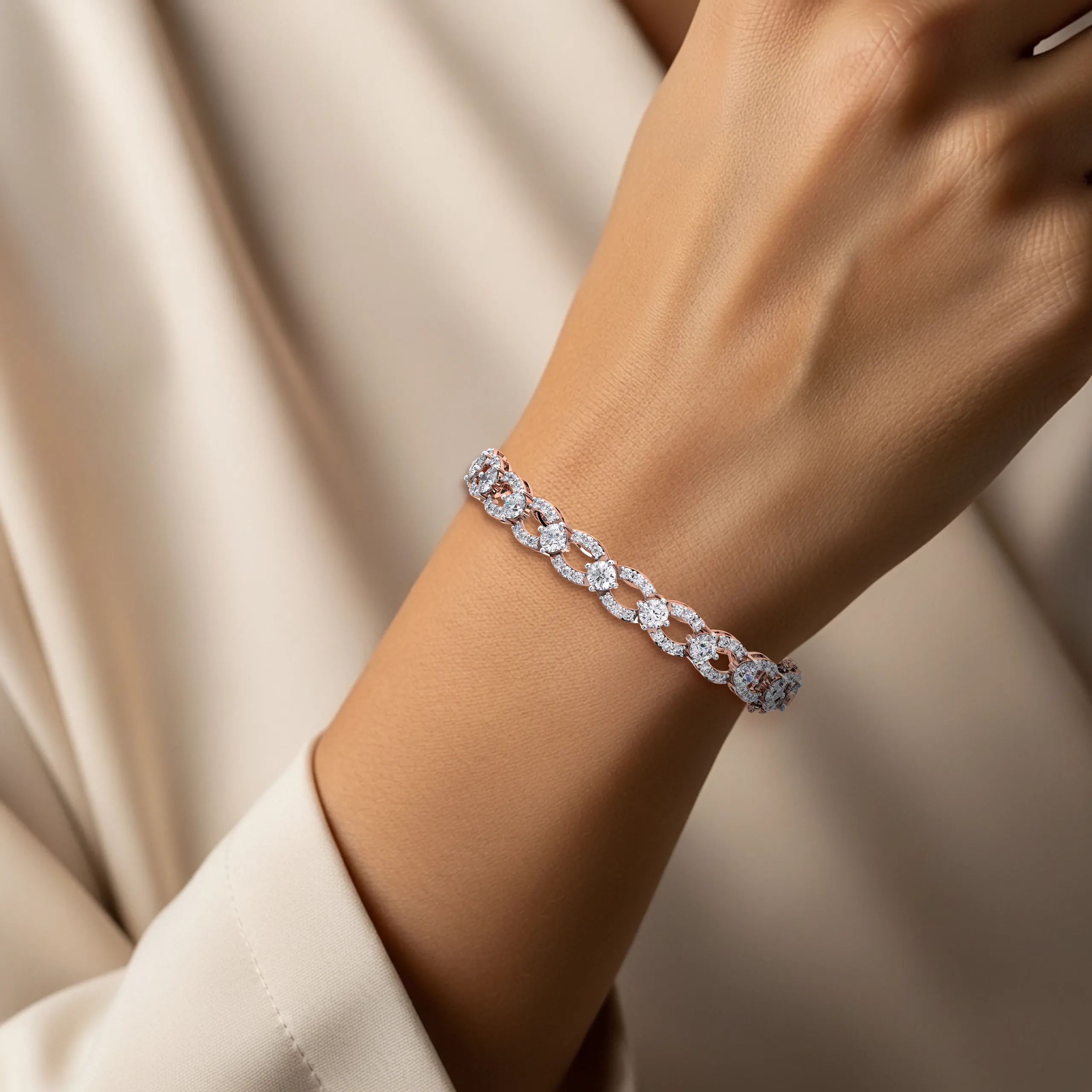 A bold and brilliant bangle featuring oval-linked motifs adorned with dazzling round diamonds for a look that’s both structured and sophisticated.