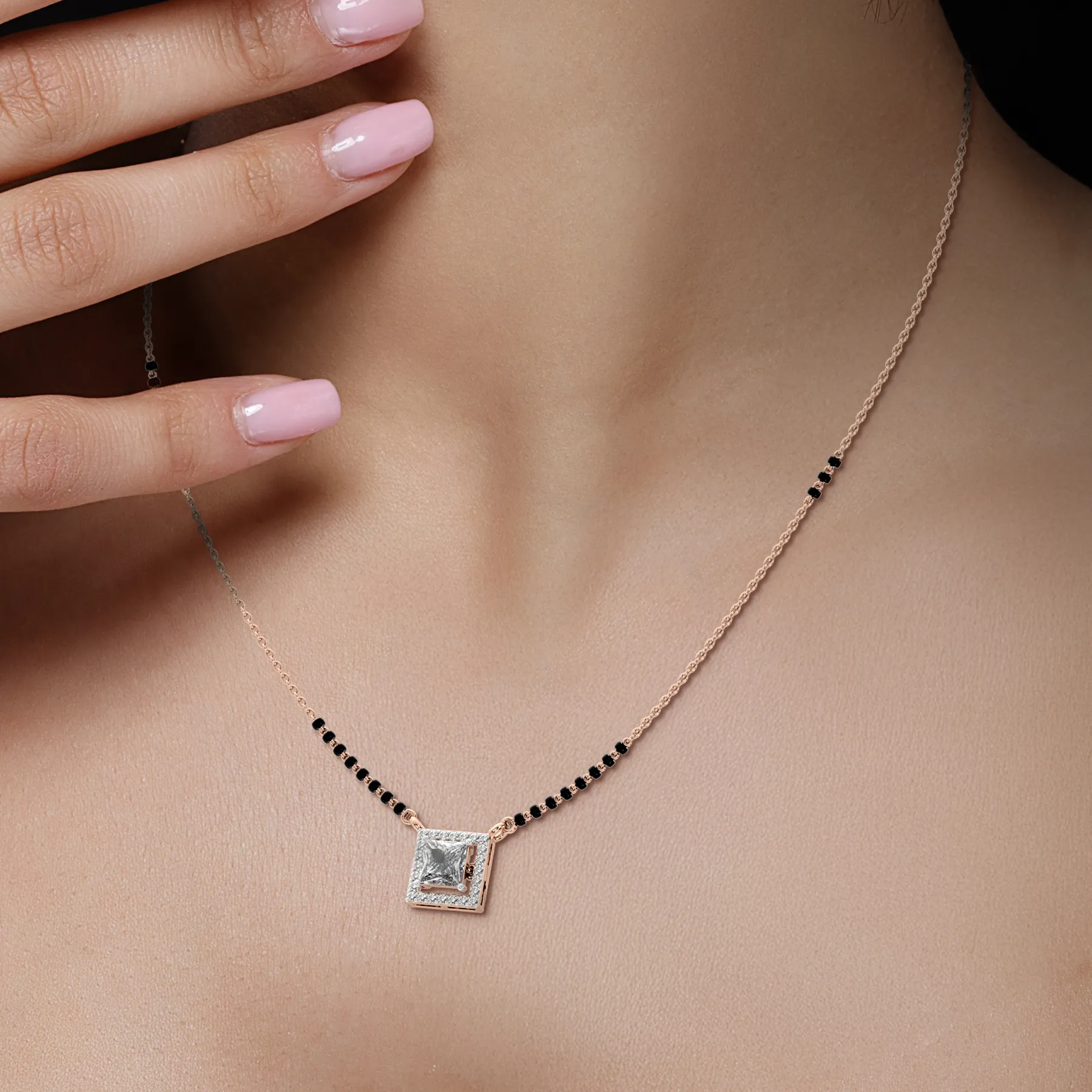 Celebrate your union with our Geometric Diamond Mangalsutra. This unique piece features a modern design with a square halo setting, adorned with sparkling diamonds. The geometric pattern offers a contemporary take on a traditional symbol, making it a striking bridal accessory. This mangalsutra is a testament to modern elegance and lasting commitment.