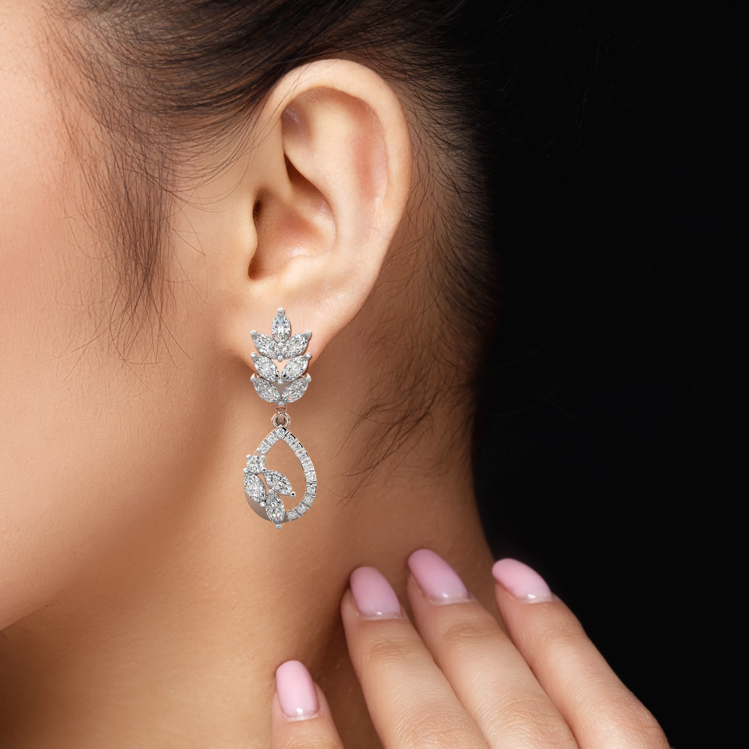 Elegant diamond earrings featuring a cascading cluster of marquise diamonds leading to a brilliant teardrop-shaped design, crafted for graceful sparkle and timeless elegance.
