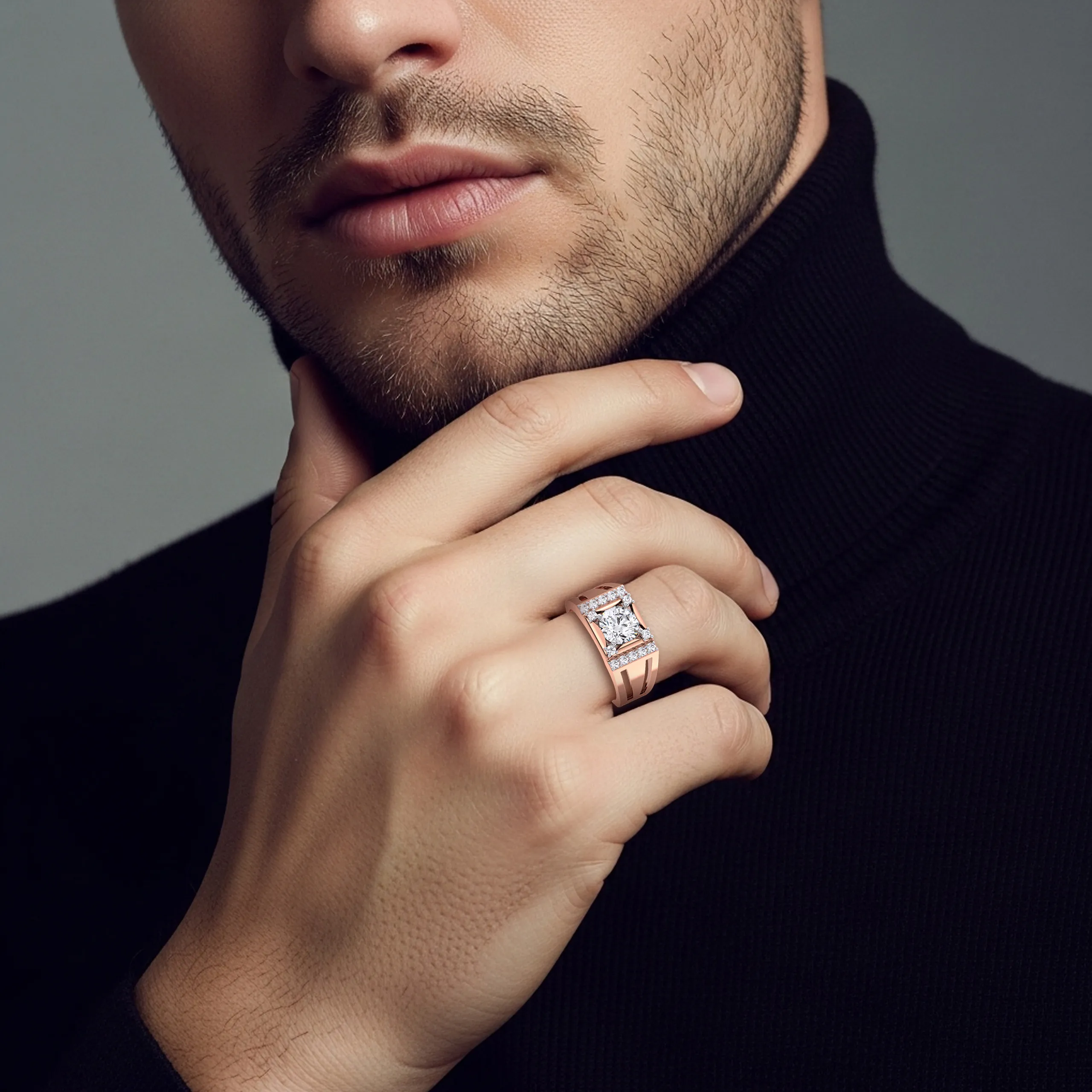 A bold and refined men’s diamond ring featuring a striking central stone framed with brilliant accents for a powerful, elegant look.