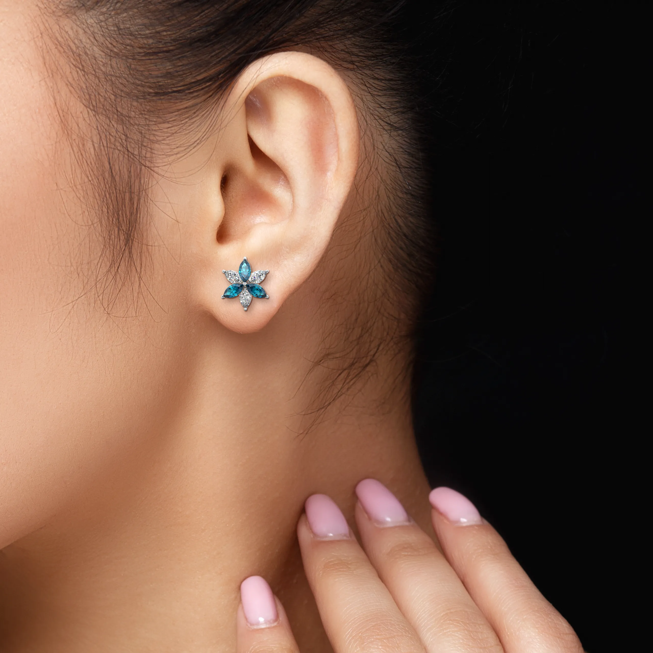 Inspired by nature’s elegance, the Ocean Bloom Earrings feature a six-petal floral design with alternating vivid blue gemstones and brilliant marquise cut diamonds. Each petal is precisely cut and symmetrically arranged to form a captivating bloom that radiates charm and confidence. The meticulous craftsmanship and unique color pairing make them a must-have for any fine jewelry lover.