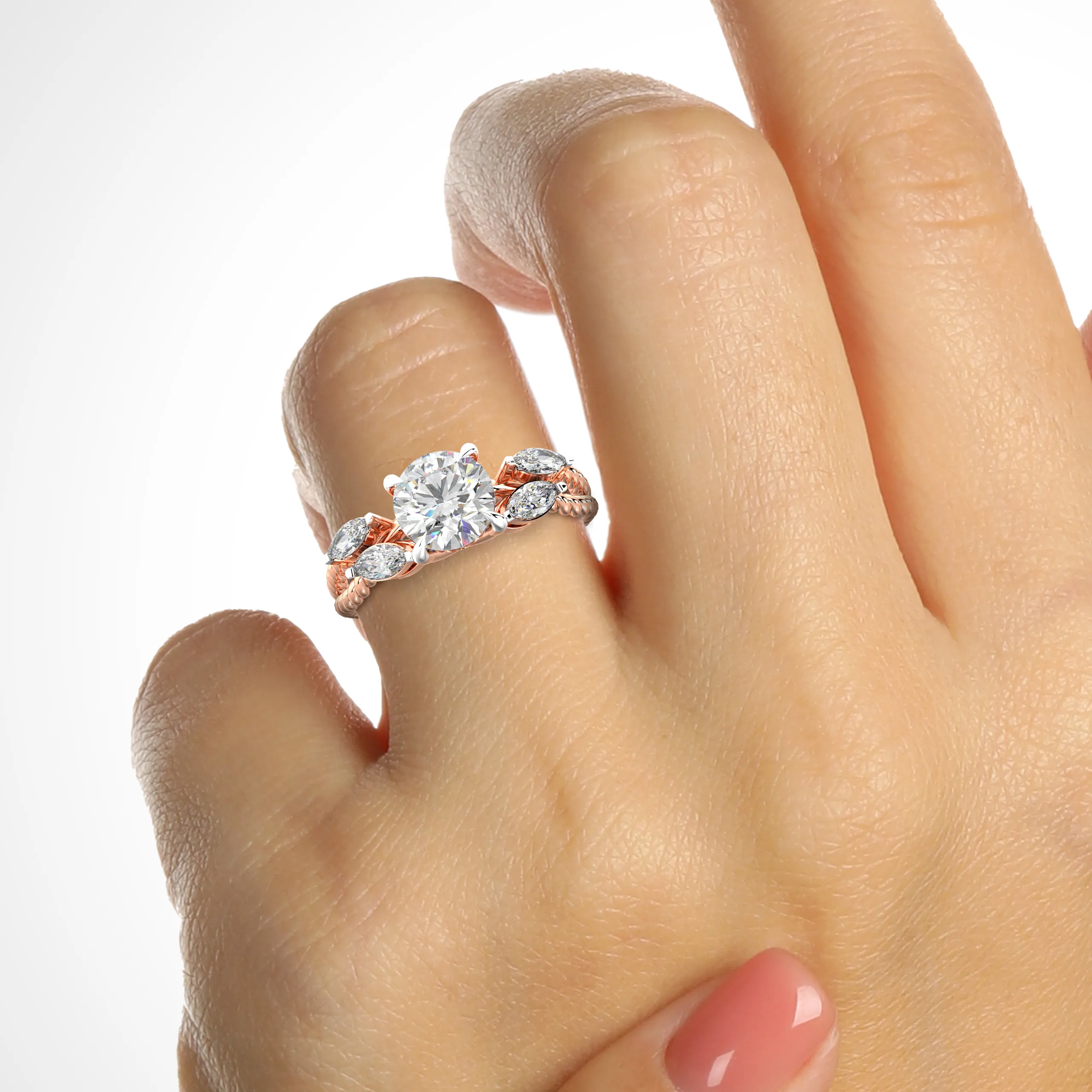 A luxurious round-cut diamond ring with marquise accents and a sculptural twisted band, crafted for elegance with a bold twist.