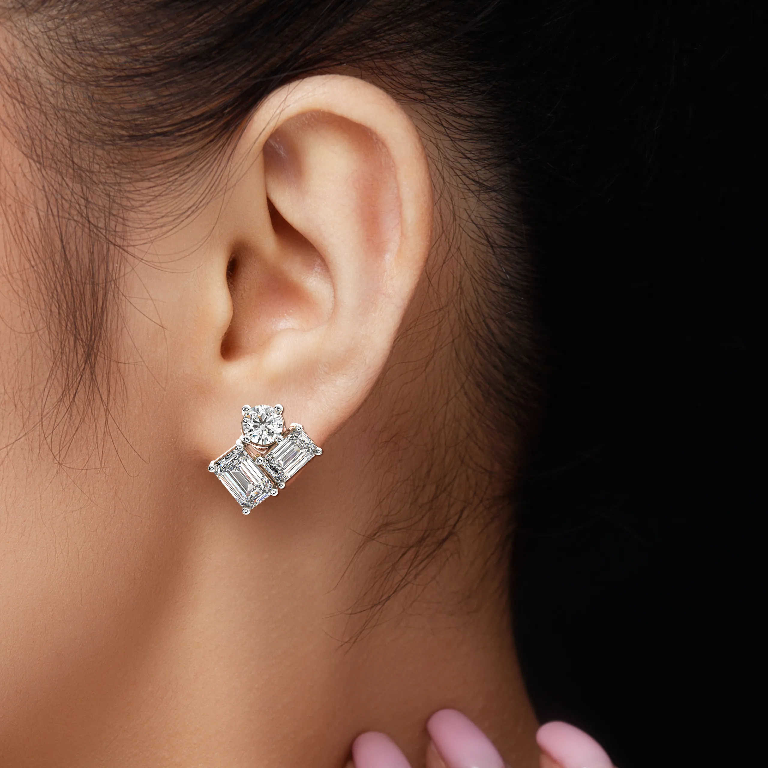 The Trio Flair Diamond Earrings reflect refined elegance with a modern touch. A brilliant round diamond sits at the top, beautifully paired with two sleek emerald-cut diamonds arranged in a diagonal drop formation.